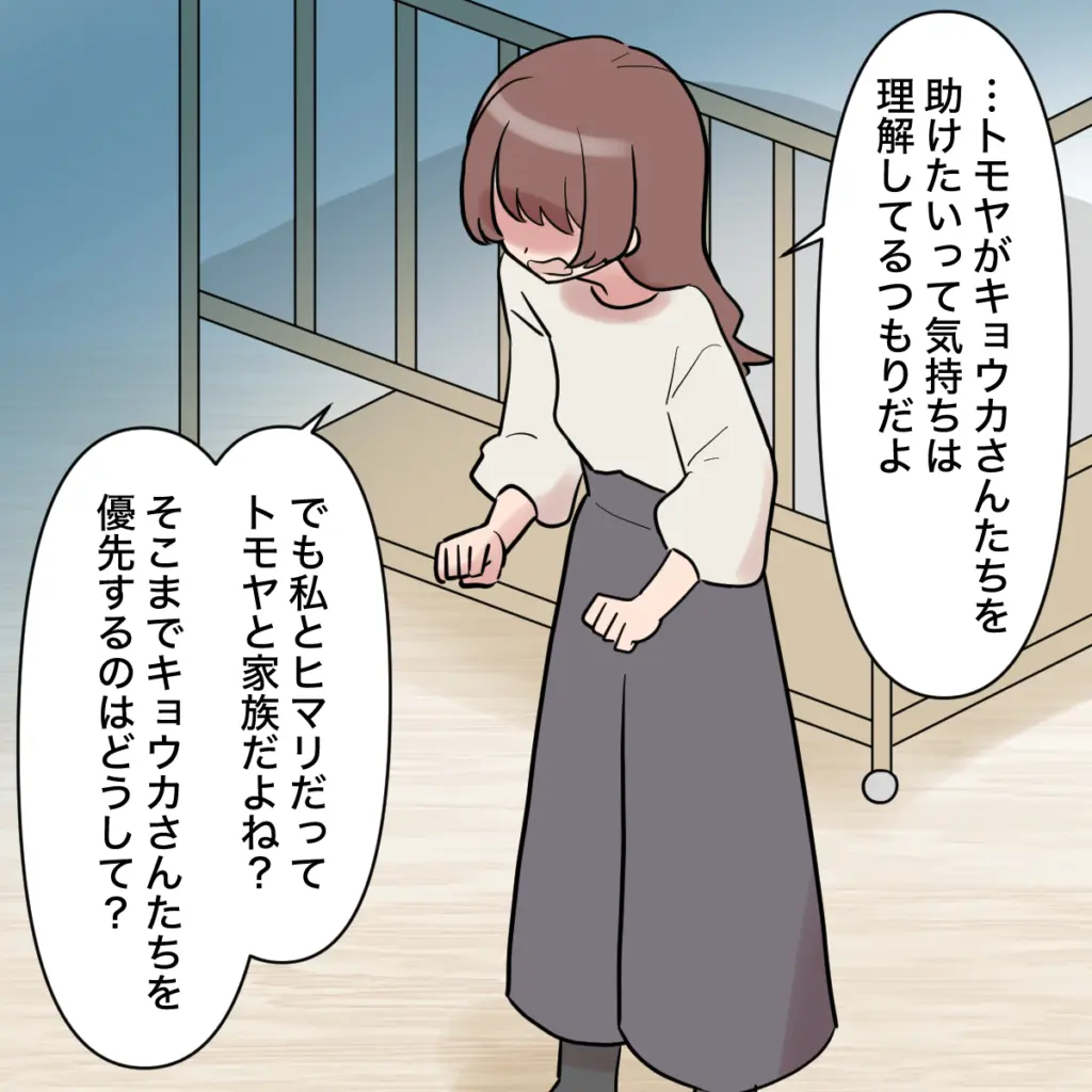 キョウカさんたちの状況を理解しようと努めているアヤノさんが、「そこまでキョウカさんたちを優先するのはどうして?」とたずねるのは当然!家族を放置して実家にずっといるなんて、何か理由があるに決まってますよね。本当アヤノさんの言う通り、トモヤさんは口ばっかり!!家族の絆はどんどん崩れてしまいますよね。