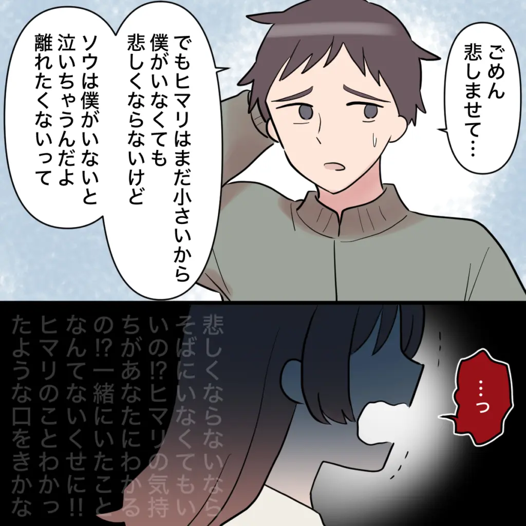 「ごめん。悲しませて・・でもヒマリはまだ小さいから、僕がいなくても悲しくならないけど、ソウは僕がいないと泣いちゃうんだよ。離れたくないって」困ったようにそういうトモヤの言葉に、「・・っ」と声を詰まらせながら、「悲しくならないならそばにいなくてもいいの!?ヒマリの気持ちがあなたにわかるの!?一緒にいたことなんてないくせに!!ヒマリのことわかったような口をきかないで!!」と心の中で叫んでいました。