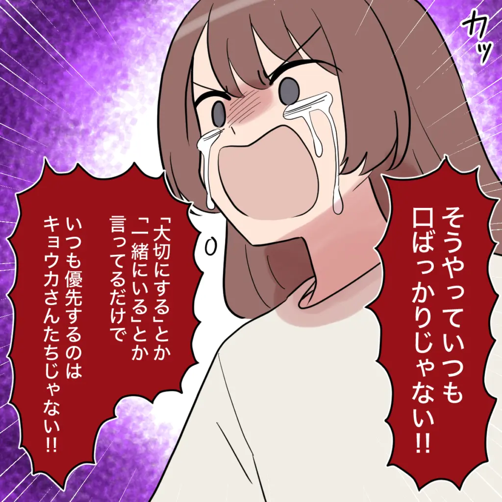 「そうやっていつも口ばっかりじゃない!!『大切にする』とか『一緒にいる』とか言ってるだけで、いつも優先するのはキョウカさんたちじゃない!!」涙を流しながらそう訴えると、