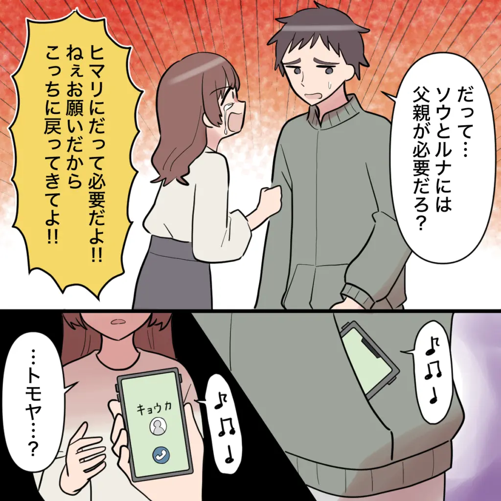 「だって・・ソウとルナには父親が必要だろ?」と困ったように言うトモヤに、「ヒマリにだって必要だよ!!ねぇお願いだからこっちに戻ってきてよ!!」私がそう詰め寄ると、トモヤの上着のポケットからスマホの音が・・。夫婦で真剣な話し合いをしているというのに、平然とスマホを取り出し、画面を見つめるトモヤに、「・・トモヤ・・?」と声をかけるも何も聞こえていないようでした。