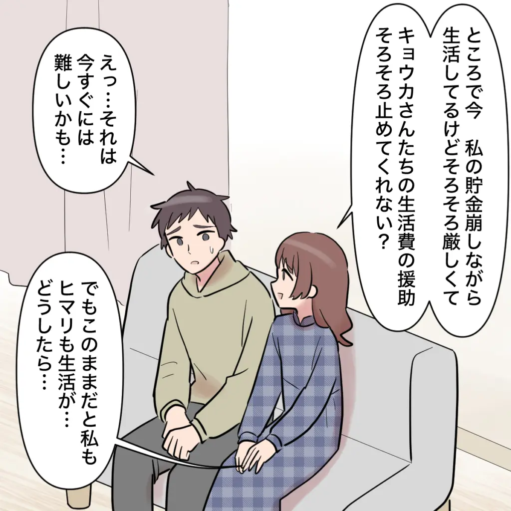 その後、「ところで今、私の貯金を崩しながら生活してるけどそろそろ厳しくて。キョウカさんたちの生活費の援助そろそろ止めてくれない?」と切り出しました。トモヤは「えっ。それは・・今すぐには難しいかも」と予想通りの反応。私は「でもこのままだと私もヒマリも生活が。どうしたら・・」