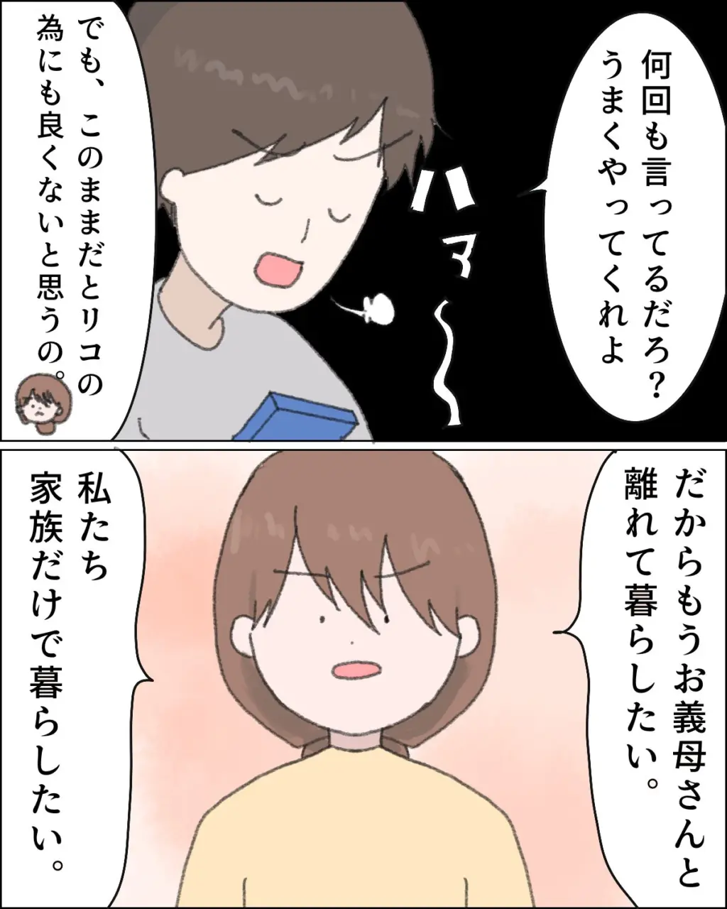 「何回も言ってるだろ?うまくやってくれよ」大きくため息をつくコウイチさんに、私は「でも、このままだとリコのためにも良くないと思うの」と食い下がります。そして大きく息を吸い込み、「だからもうお義母さんと離れて暮らしたい、私たち家族だけで暮らしたい」コウイチさんの目をまっすぐ見て伝えました。