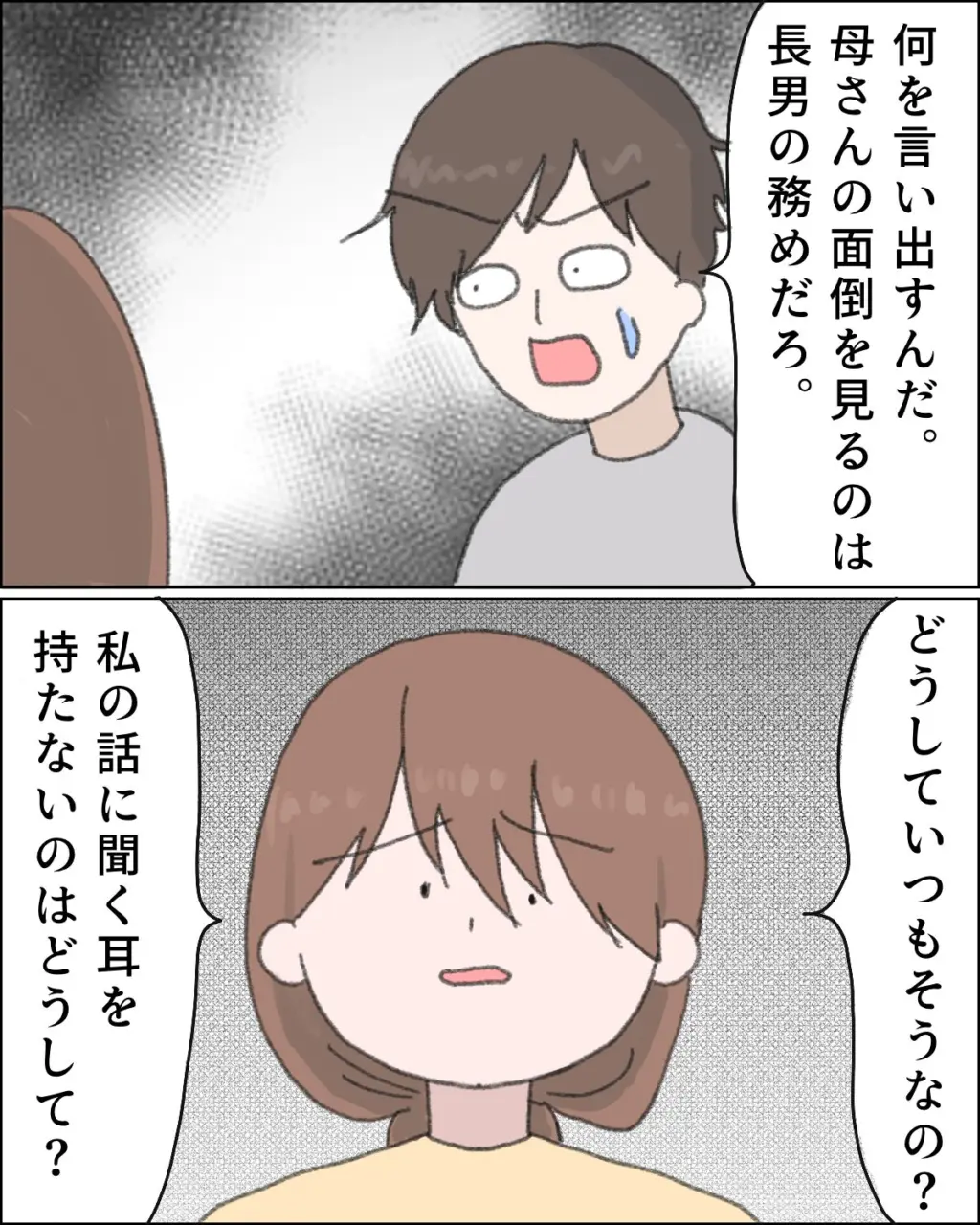 私の言葉に、コウイチさんは目を丸くして「何を言い出すんだ、母さんの面倒を見るのは長男の務めだろ」と、まるで理解不能だと言わんばかりの態度を取ります。私はそんなコウイチさんに「どうしていつもそうなの?私の話に聞く耳を持たないのはどうして?」と必死に訴えかけました。