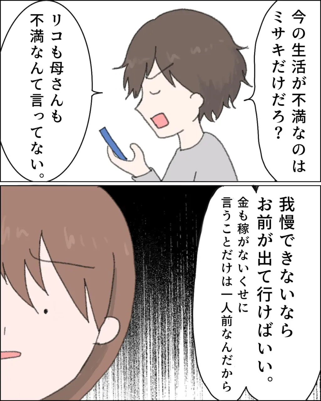 けれど、私の思いはコウイチさんには届かなかったようで、「今の生活が不満なのはミサキだけだろ?リコも母さんも不満なんて言ってない」と言われてしまいました。さらに「我慢できないならお前が出て行けばいい」と突き放され、私は目の前が真っ暗になりました。