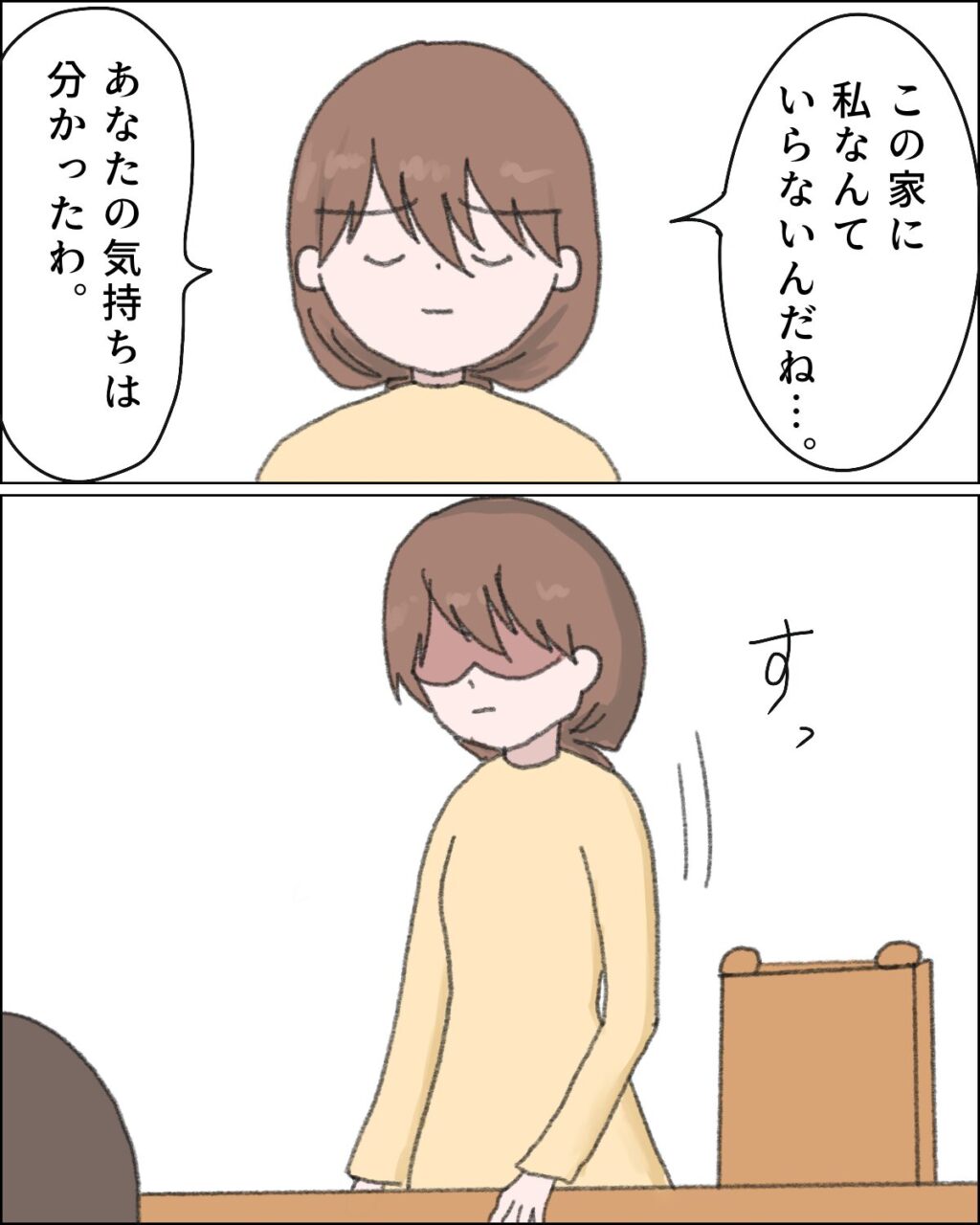コウイチさんの言葉で、私はこの家で誰からも必要とされていないのだと悟りました。「この家に私なんていらないんだね・・・あなたの気持ちは分かったわ」そう告げて、私はそれ以上話し合うのをやめました。