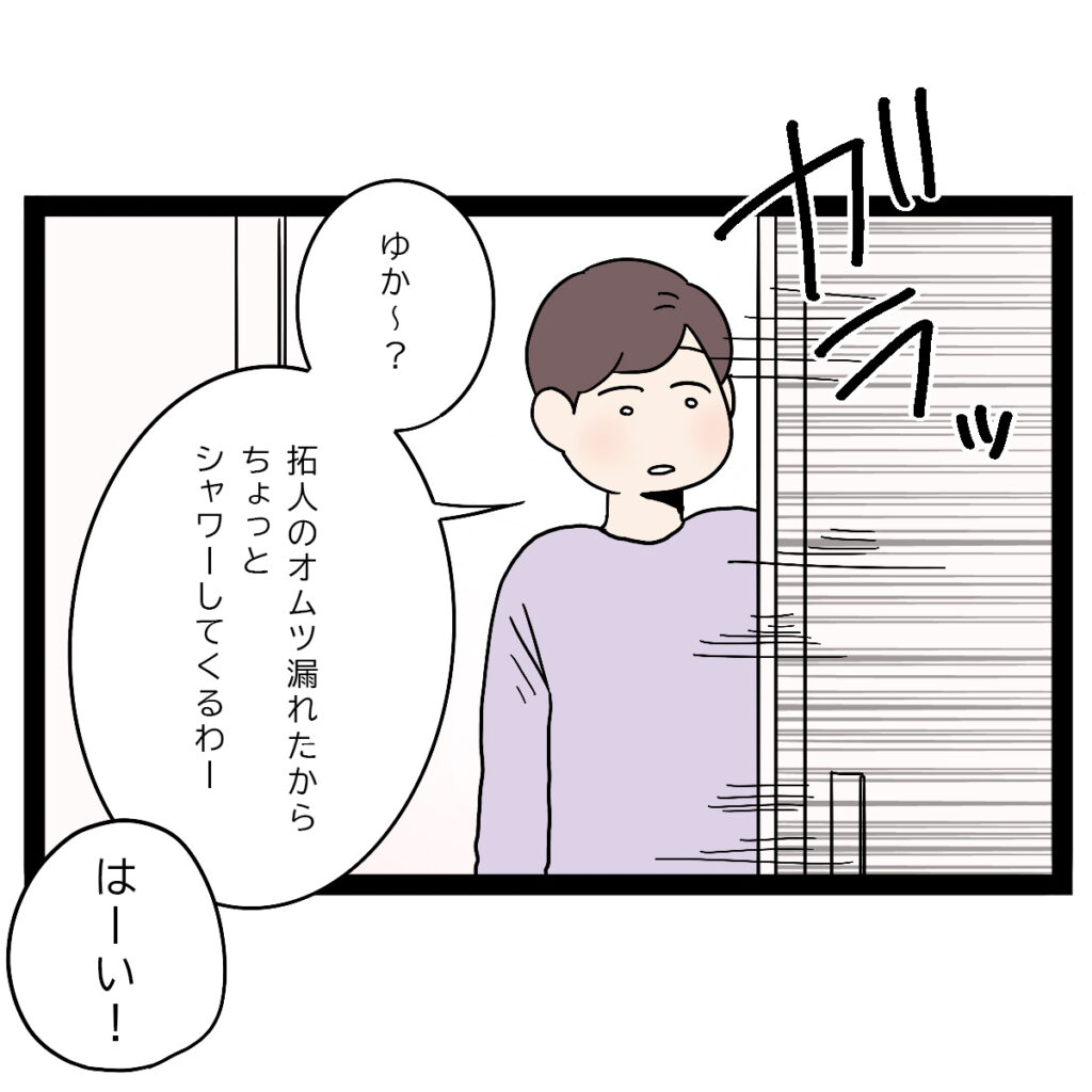 すると、「ゆか~?拓人のオムツ濡れたからちょっとシャワーしてくるわー」まさひでが顔を出してそう言うと、「はーい!」とゆかちゃんが返事をしました。