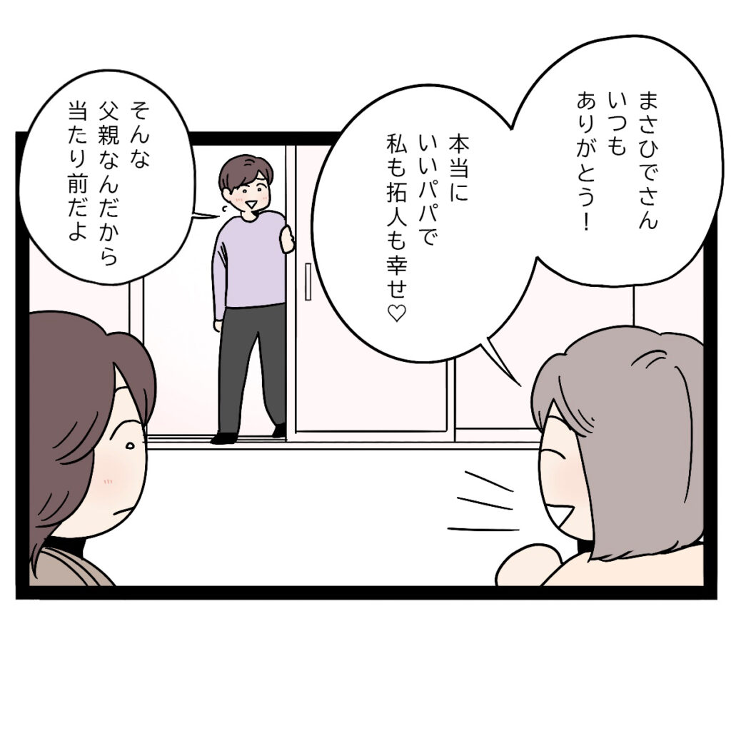 そして、「まさひでさん、いつもありがとう!本当にいいパパで私も拓人も幸せ」ゆかちゃんがちょっぴり甘えながらそう言うと、「そんな。父親なんだから当たり前だよ」と照れながら答えるまさひで。そんな2人のやりとりを見ていた私が、