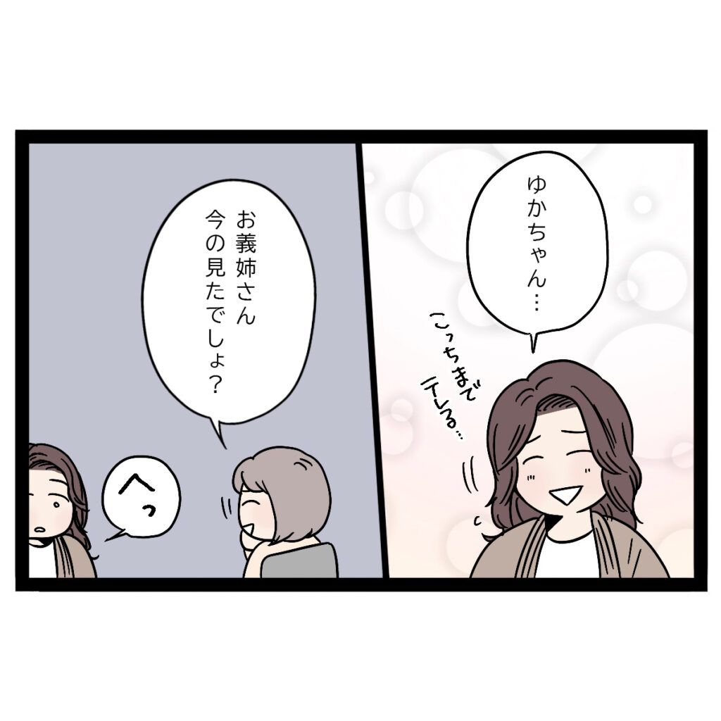 「ゆかちゃん・・こっちまで照れるよ~」と思いながらそう言うと、「お義姉さん、今の見たでしょ?」と囁くゆかちゃん。私は「へっ?」と言いながら、何のことだろうと思っていました。