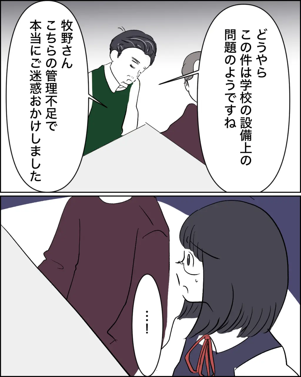すると、「どうやらこの件は学校の設備上の問題のようですね」と言った後、「牧野さん、こちらの管理不足で本当にご迷惑おかけしました」といじめを設備の問題にしようとする学年主任の先生の言葉に驚いていると、