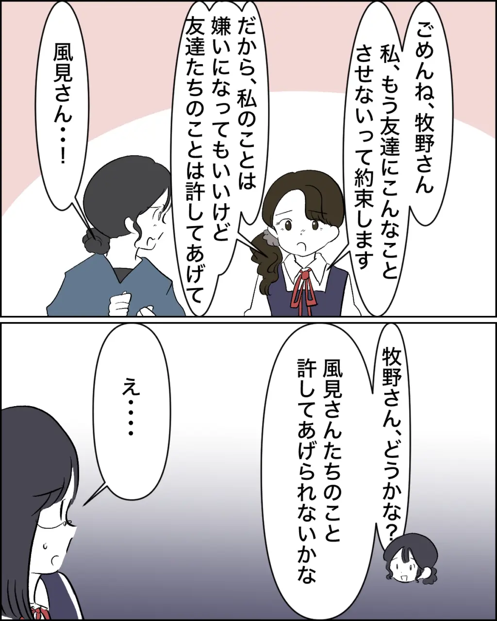 「ごめんね、牧野さん。私、友達にこんなことさせないって約束します。だから、私のことは嫌いになってもいいけど友達のことは許してあげて」風見さんがそう言うと、「風見さん・・!」驚く水原先生が、「牧野さん、どうかな?風見さんたちのこと許してあげられないかな」と事を収める方向に。全く意味をなさない話し合いの結末になりそうで「え・・」と歩実も動揺していました。