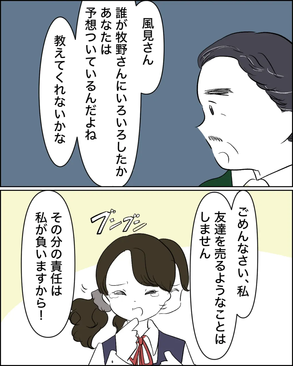 その後、学年主任の先生が「風見さん。誰が牧野さんにいろいろしたか、あなたは予想ついているんだよね。教えてくれないかな」とたずねると、「ごめんなさい、私、友達を売るようなことはしません。その分の責任は私が負いますから!」そう言って風見さんが頭をブンブンと振りました。