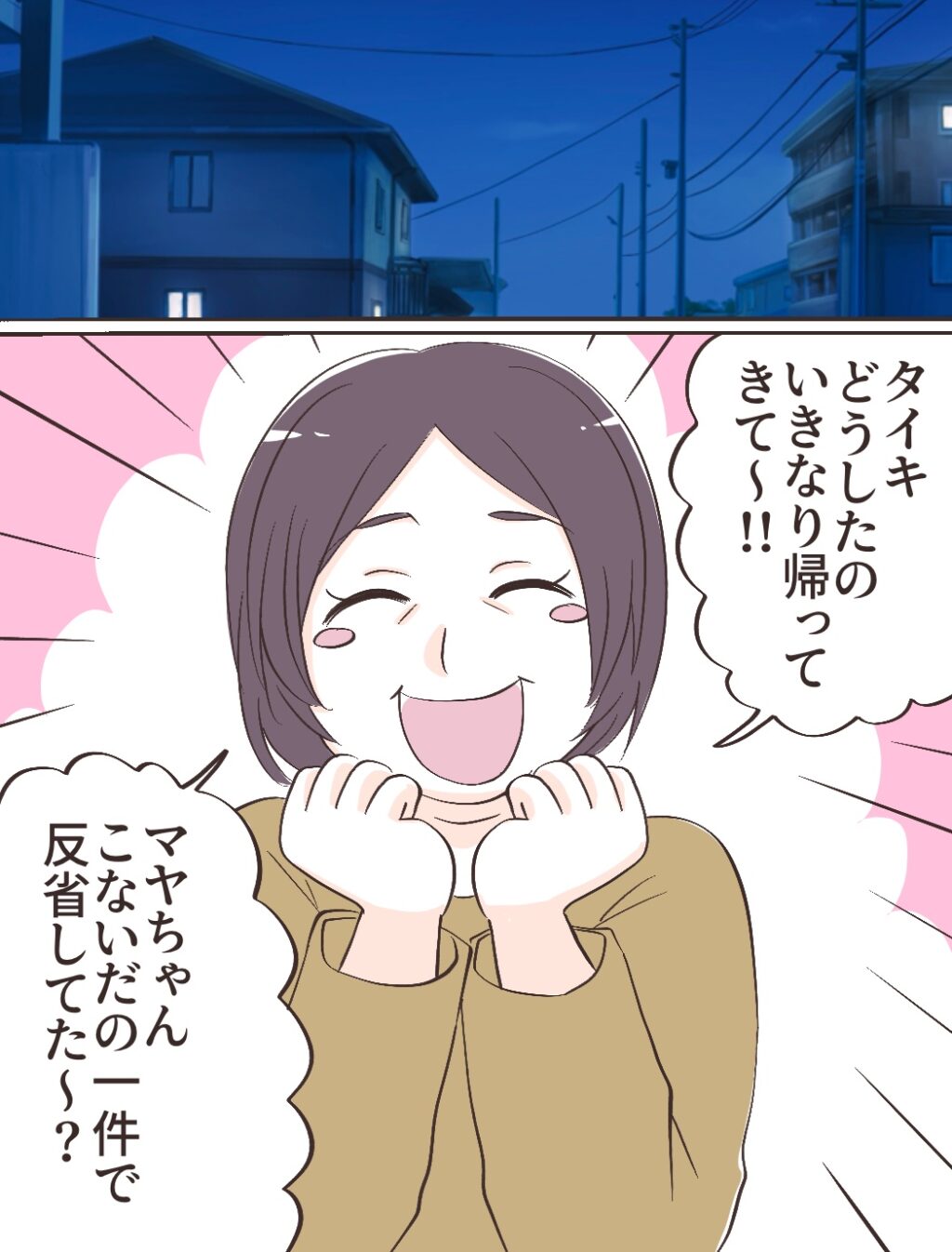 「タイキどうしたの?いきなり帰ってきて~!!」と嬉しそうな義母が「マヤちゃん、こないだの一件で反省してた~?」と笑顔で言うと、