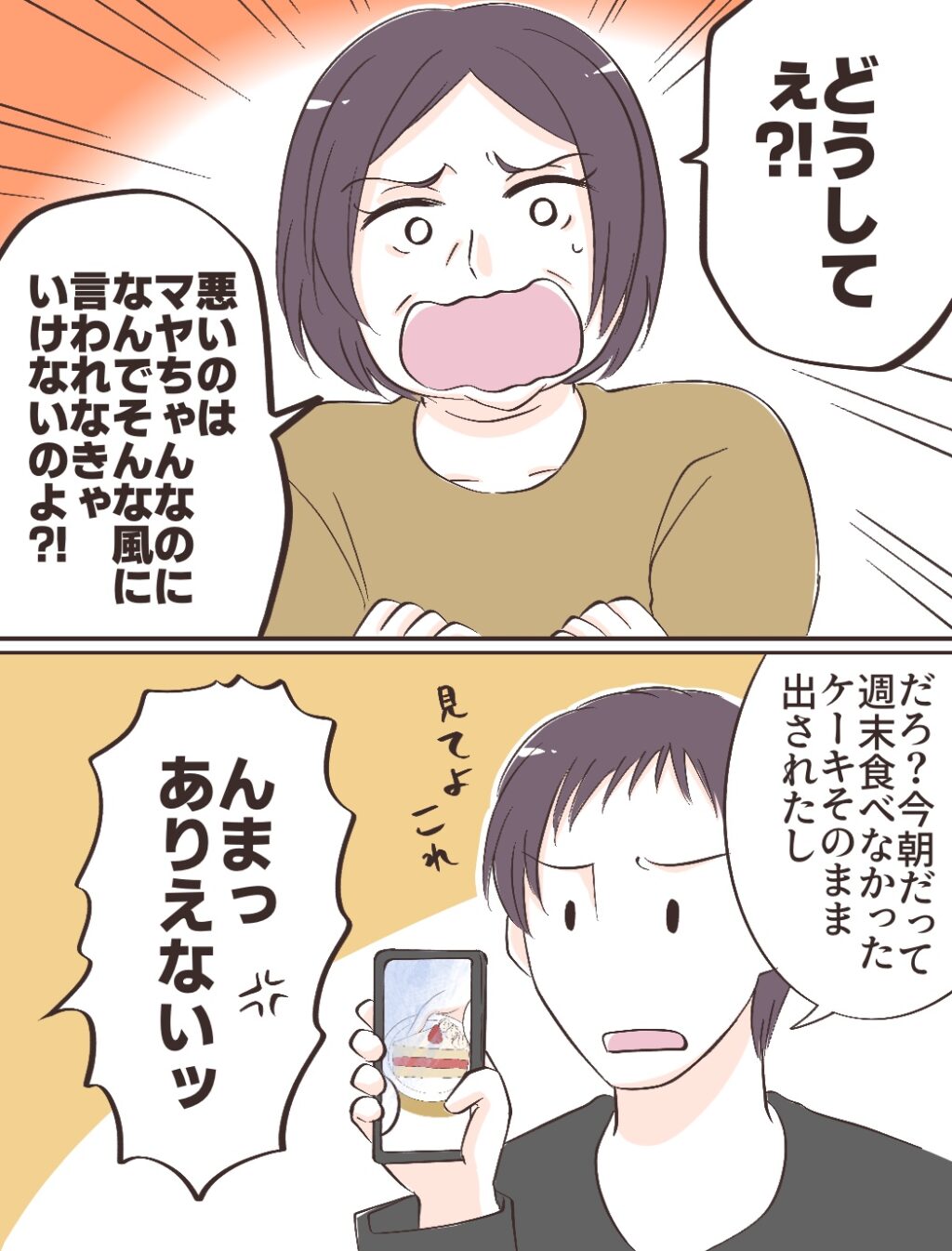 「どうしてぇ!?悪いのはマヤちゃんなのに、なんでそんな風に言われなきゃいけないのよ!?」と驚く義母に、「だろ?今朝だって週末食べなかったケーキそのまま出されたし。見てよコレ」とマヤさんに出されたケーキの画像を見せながら文句を言うタイキさん。すると「んまっ!ありえないッ!!」と義母まで大興奮!