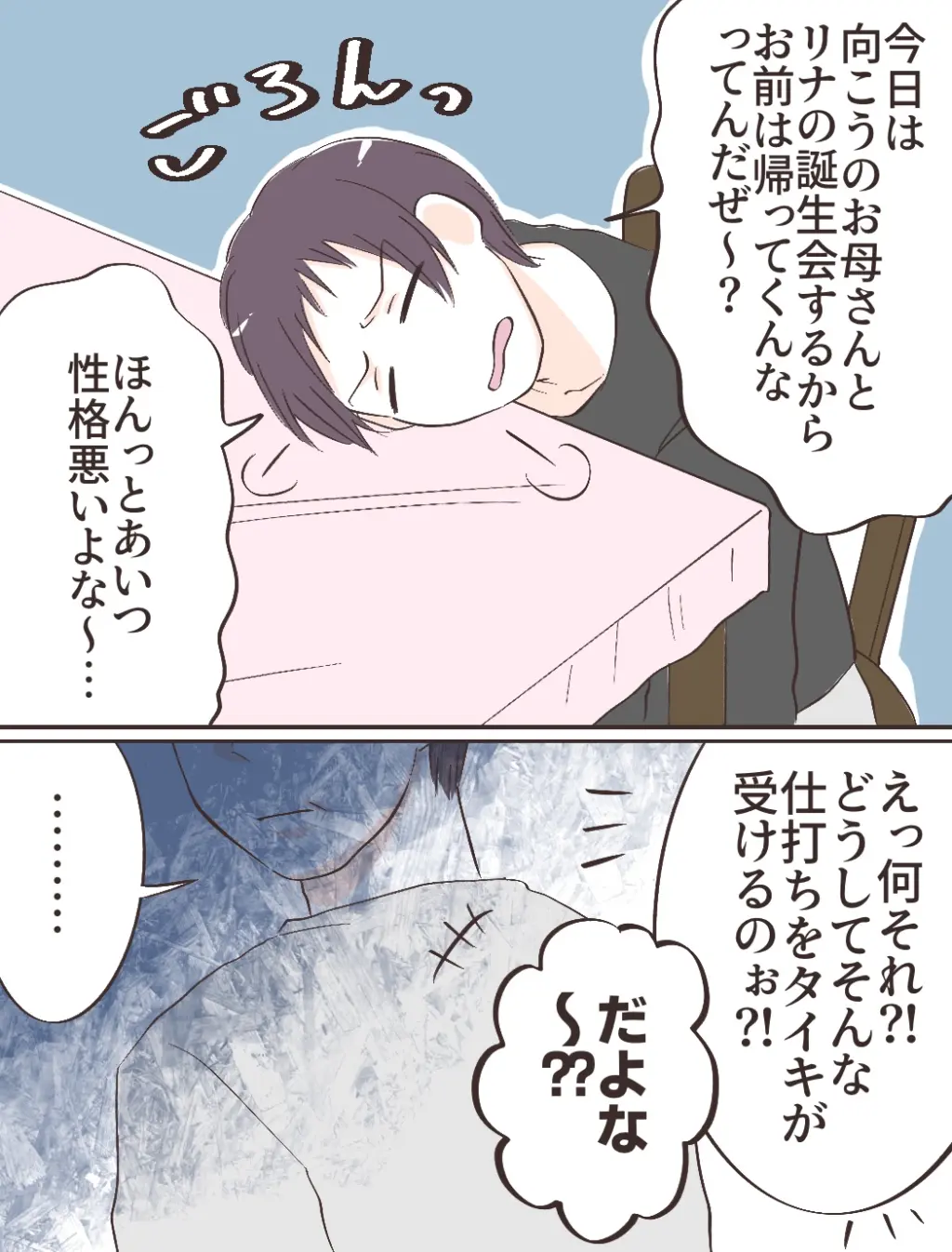 「今日は向こうのお母さんとリナの誕生会するからお前は帰ってくんなってんだぜ~?ほんっとあいつ性格悪いよな~・・」とテーブルに突っ伏してタイキがそう言うと、「えっ何それ!?どうしてそんな仕打ちをタイキが受けるのぉ!?」と義母が返し、「だよな~??」とタイキも賛同を求めていました。