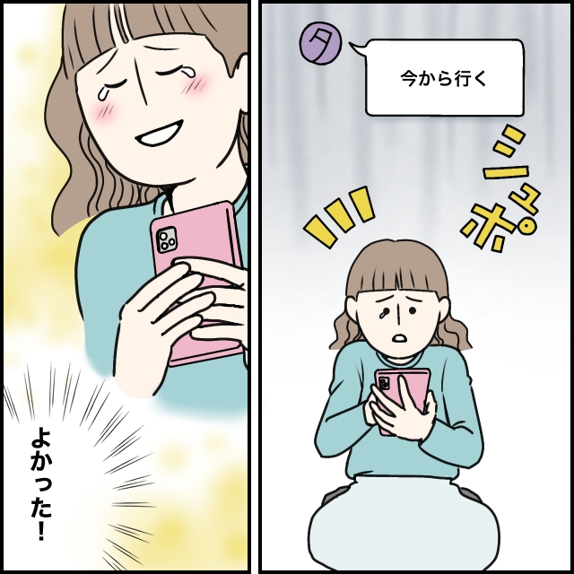 このまま別れるなんて嫌。せめてちゃんと話がしたい。タカシからの連絡を待っている間、私はスマホを片時も手放せませんでした。そして翌日、旅行から帰ってきたのか、タカシから「今から行く」と連絡がありました。私は胸の前でスマホを握りしめ「よかった!」と安堵します。