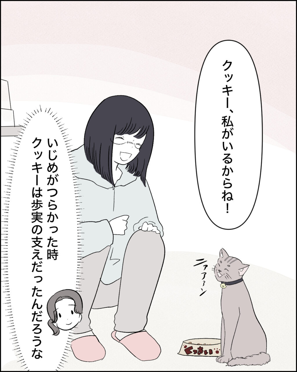 夕食を食べ終えた歩実は、クッキーのところへ行き「クッキー、私がいるからね!」と笑顔で話しかけていました。その姿を見て「いじめがつらかった時、クッキーは歩実の支えだったんだろうな」と強く感じた私は、クッキーに心から感謝しました。