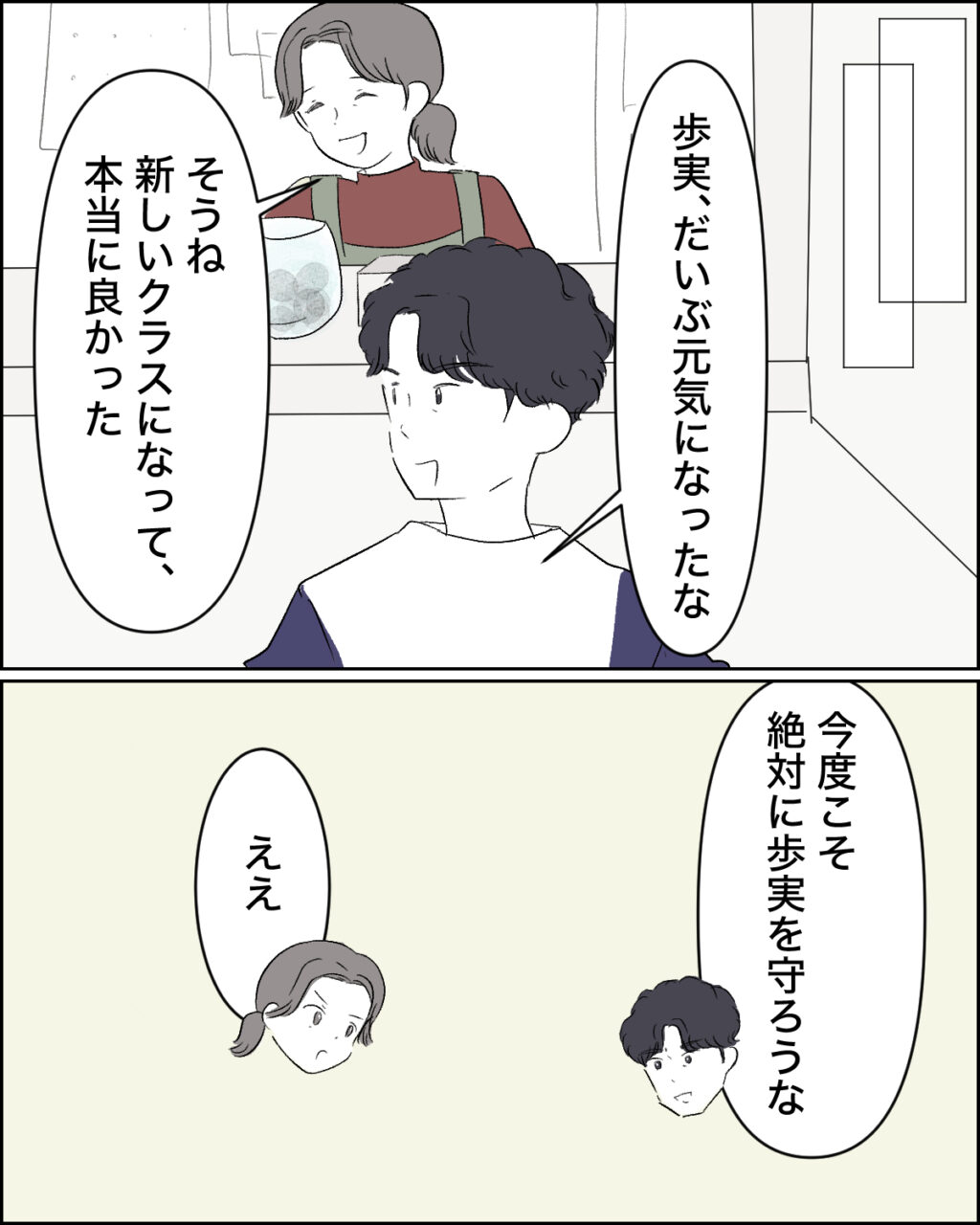 歩実が自分の部屋に行った後、「歩実、だいぶ元気になったな」「そうね。新しいクラスになって本当に良かった」と喜び合った私たちは、「今度こそ絶対に歩実を守ろうな」「ええ」と固く約束しました。このまま歩実が笑顔で学校に通えることを願ってやみません。