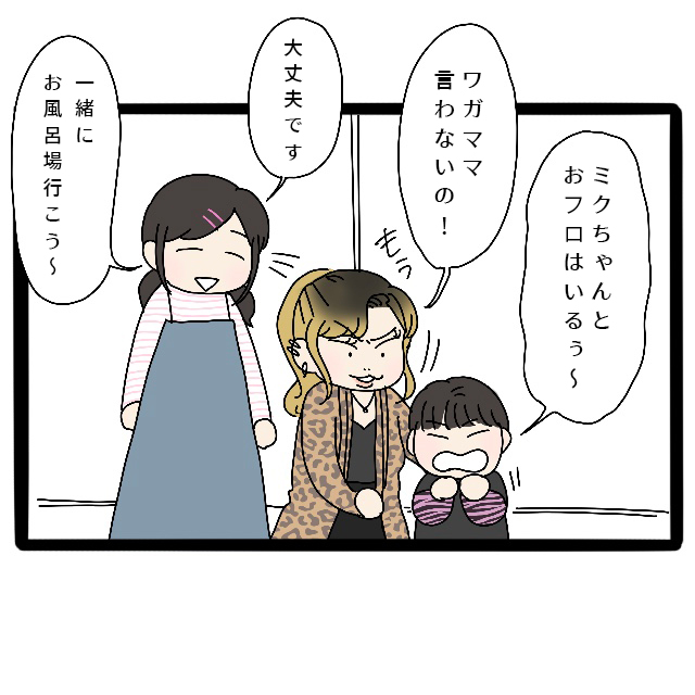 お風呂の用意をしていると、コウキくんが「ミクちゃんとおフロはいるぅ~」とぐずり出し、サチさんが「ワガママ言わないの!」とたしなめていました。すると小6の娘ミクが「大丈夫です。一緒にお風呂場行こう~」とコウキくんをお風呂場に連れて行ってくれました。