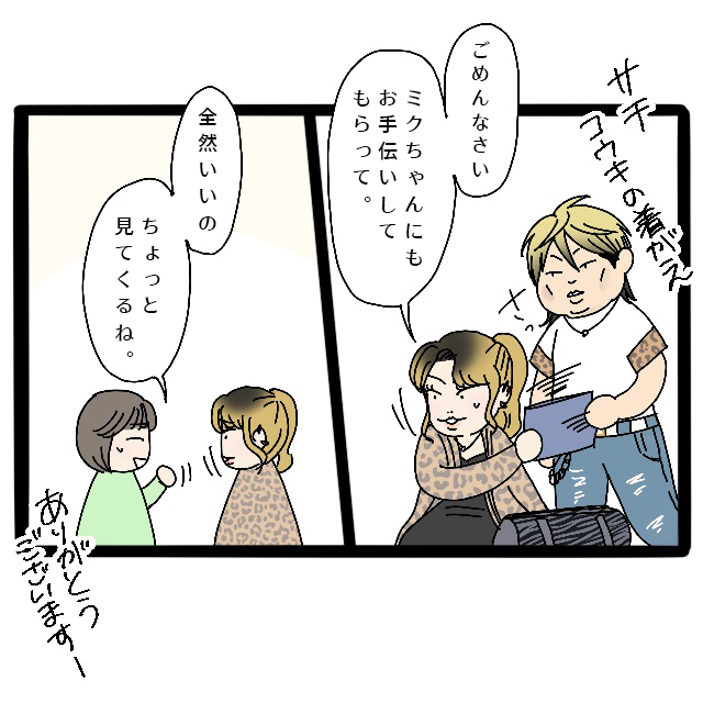 ミクとコウキくんがお風呂場に行くと、急に信也君が「サチ、コウキの着替え」とテキパキ動き出し、サチさんは「ごめんなさい。ミクちゃんにもお手伝いしてもらって」と申し訳なさそうにしつつもカバンからさっとコウキくんの着替えを取り出し信也君に渡します。あ、ミクに任せる気満々ね・・と感じつつ「全然いいの。ちょっと見てくるね」と言って私はお風呂場に向かいました。