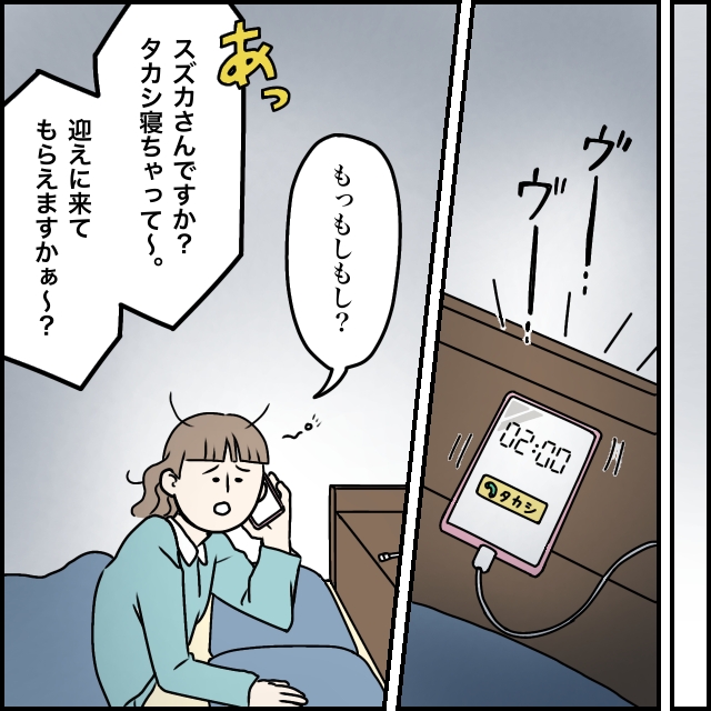 「あっ、スズカさんですか?タカシ寝ちゃって~。迎えに来てもらえますかぁ~?」と電話の声が言いました。