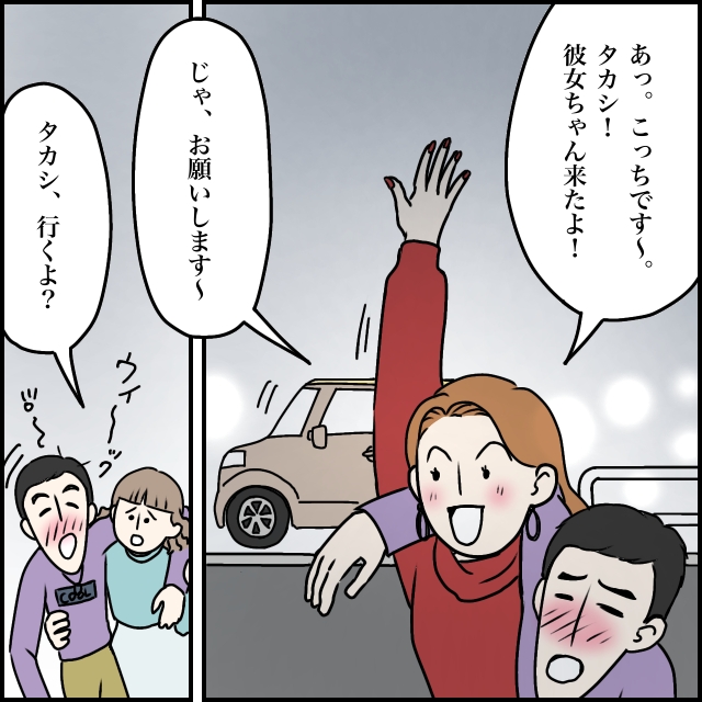 女の子に教えてもらった場所にタカシを迎えに行くと、「あっ。こっちです~。タカシ!彼女ちゃん来たよ!」とタカシを抱きかかえた女の子が、「じゃ、お願いします~」と言ってタカシを託されました。「タカシ、行くよ?」タカシにそう声をかけなんとか車に押し込むと、