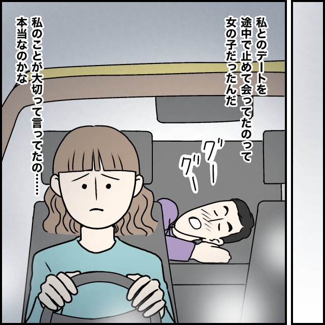 車を走らせた私。私とのデートを途中で止めて会ってたのって女の子だったんだ。私のことが大切って言ってたの・・本当なのかな。タカシの行動を見ていたら、どんどん信じられなくなってしまいました。
