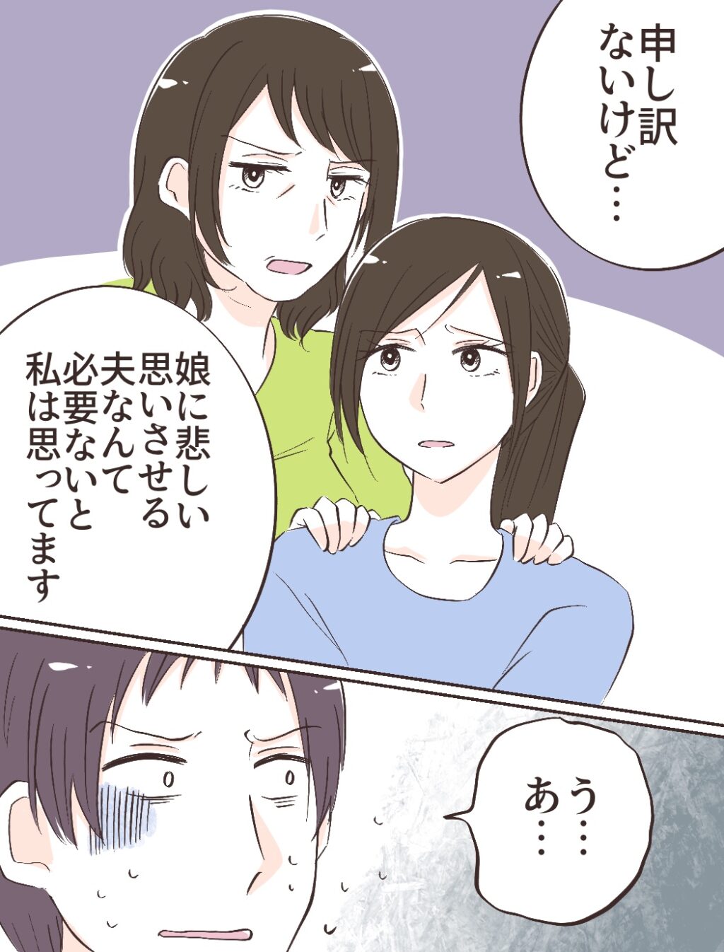 母は私の肩にそっと手を置くと「申し訳ないけど、娘に悲しい思いをさせる夫なんて必要ないと私は思ってます」と冷たく言い放ちました。タイキはまずいと思ったのか、ひどく動揺した様子で「う・・あ・・」と言葉にならない声をあげます。