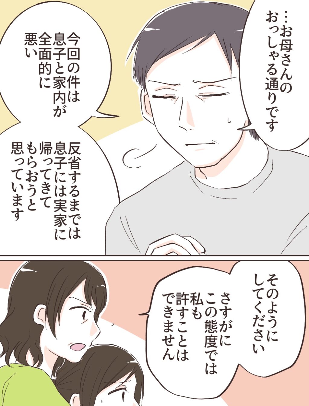 母の言葉に、義父は小さくため息をつき「お母さんのおっしゃる通りです」と言いました。そして、今回の件はタイキと義母が全面的に悪いこと、反省するまでタイキには義実家で暮らしてもらおうと思っていることを私たちに話してくれました。