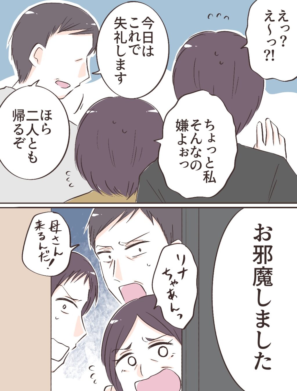 しかし、タイキと義母は最後まで納得がいかない様子で、「え~っ!?」「ちょっと私そんなの嫌よぉ」と不満を口にします。それでも義父は2人を強引に引き連れ、「お邪魔しました」と慌ただしくその場を後にしたのでした。