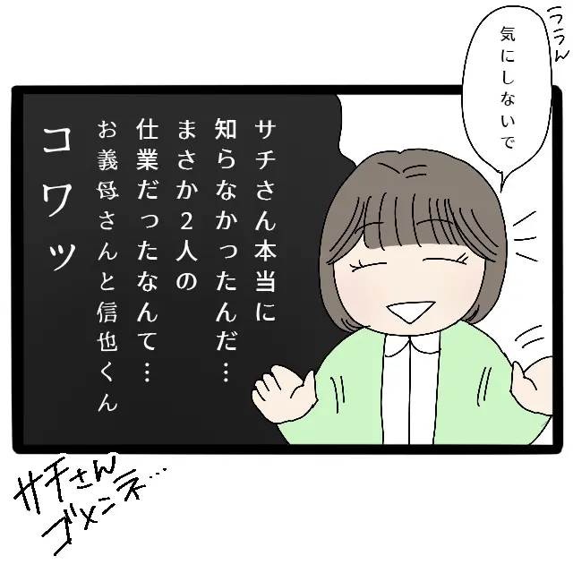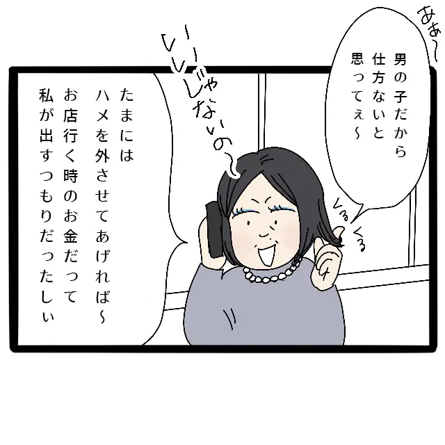 信也君が嘘をついてまでいかがわしいお店に行こうとしていたことをサチさんが説明すると、義母は「あぁ~。男の子だから仕方ないと思ってぇ~。いいじゃないの~。たまにはハメを外させてあげれば~。お店行く時のお金だって私が出すつもりだったしぃ」と悪びれることなく言いました。やはり義母は信也君の計画を知った上で信也君に協力し、サチさんや私に嘘をついていたのです。