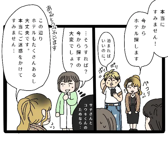 知らなかったとはいえ我が家に迷惑をかけたことを申し訳なく思い「本当にすみません!今からホテル探します」と頭を下げて必死に謝るサチさんの横で、頭をポリポリ搔きながら「泊ればいいのに」と反省ゼロの信也君。私はサチさんとコウキくんが不憫で「・・そうすれば?今から探すの大変でしょ?」と言いましたが、サチさんはそれを断り「この辺りホテルもたくさんあるし大丈夫です。本当にご迷惑をかけてすみません・・」と何度も頭を下げます。