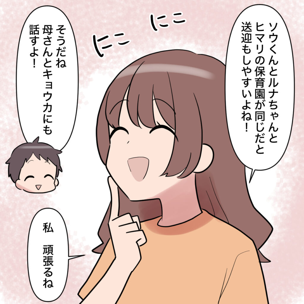 「ソウくんとルナちゃんとヒマリの保育園が同じだと送迎もしやすいよね!」私がそう提案すると「そうだね、母さんとキョウカにも話すよ!」と乗り気なトモヤ。「私、頑張るね」と伝えると、トモヤは嬉しそうな表情で、さっそくキョウカさんと義母に話をしに行きました。