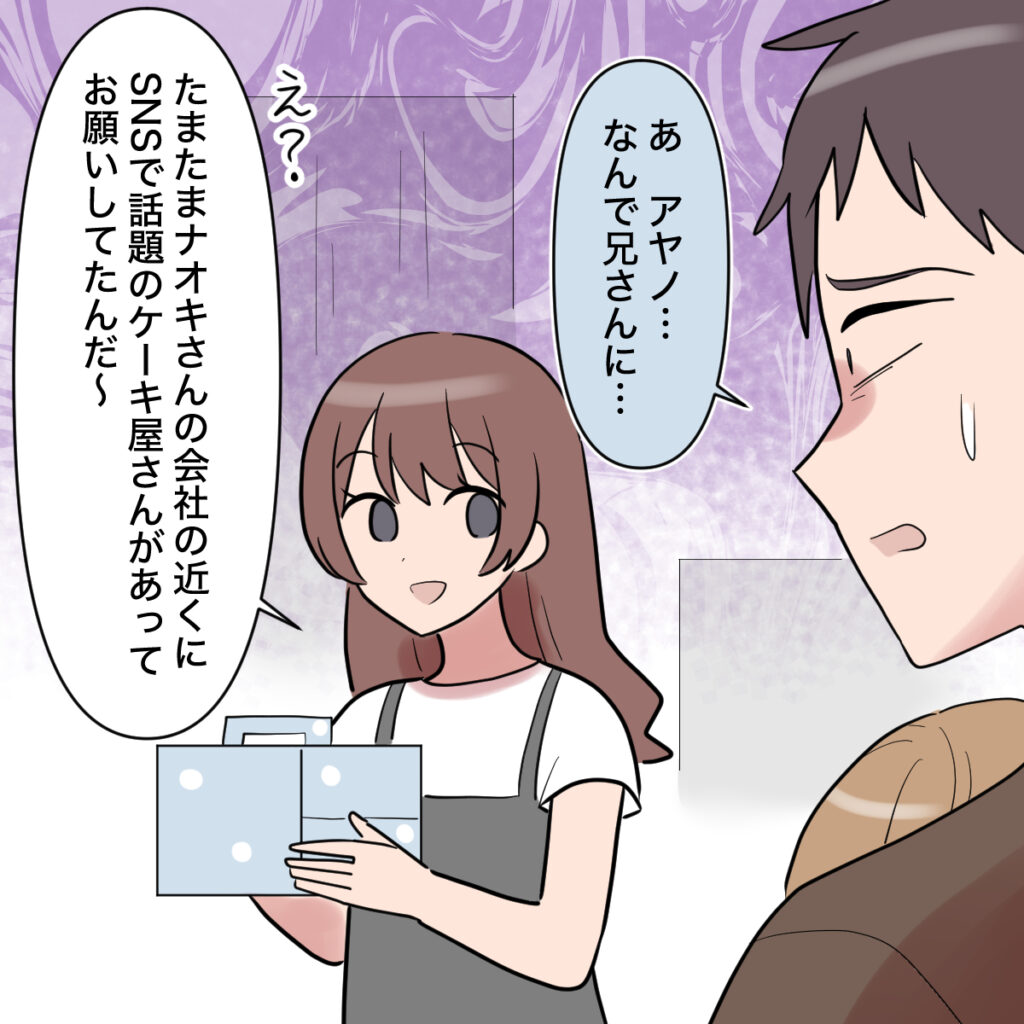 私がナオキさんからケーキを受け取るのを見て、怪訝そうな表情を浮かべる2人。するとトモヤはひどく驚いた様子で「アヤノ・・・なんで兄さんに」と尋ねてきました。私はきょとんとした顔で、「え?たまたまナオキさんの会社の近くに話題のケーキ屋さんがあってお願いしてたんだ~」と何でもないことのように答えました。