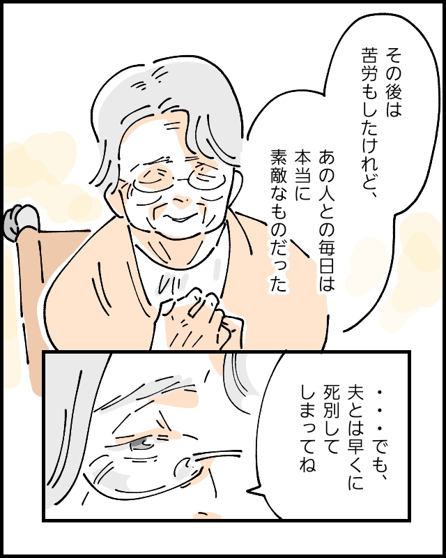 「その後は苦労もしたけれど、あの人との毎日は本当に素敵なものだった・・でも、夫とは早くに死別してしまってね」と寂しそうに言い、