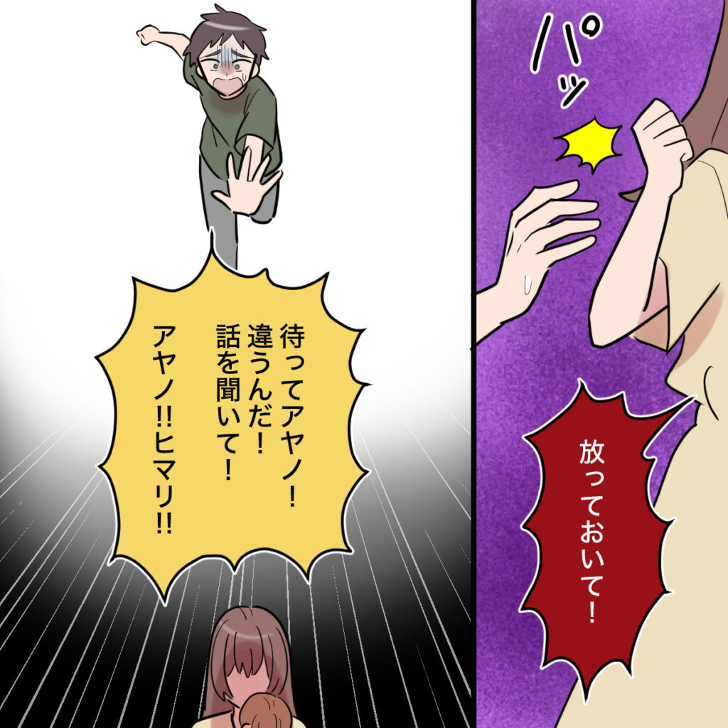 「何が違うの!?もうトモヤとは一緒にいられない!ヒマリと出ていく!」そう言って出て行こうとすると、「待って!どこに行くんだよ!」トモヤに腕を掴まれました。