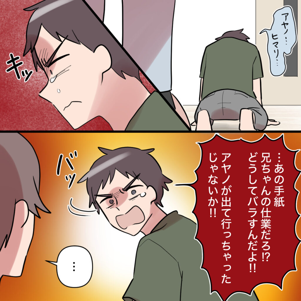 「アヤノ・・ヒマリ・・」へなへなと座り込んで嘆くトモヤは、「・・あの手紙、兄ちゃんの仕業だろ!?どうしてバラすんだよ!!アヤノが出て行っちゃったじゃないか!!」涙を流しながら怒りをぶつけるトモヤを、ナオキさんは黙って見つめていました。