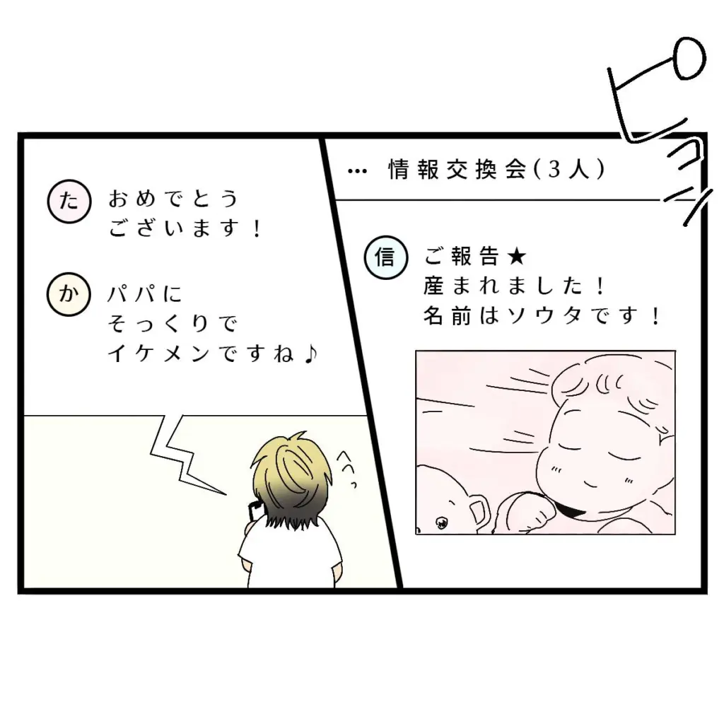 それからしばらくして、次男ソウタくんが誕生。信也さんは情報交換会のグループチャットに、「ご報告、産まれました!名前はソウタです!」とメッセージを送りました。「おめでとうございます!」「パパにそっくりでイケメンですね」ママ友からのお祝いメッセージを見て、信也さんはニヤリと笑います。