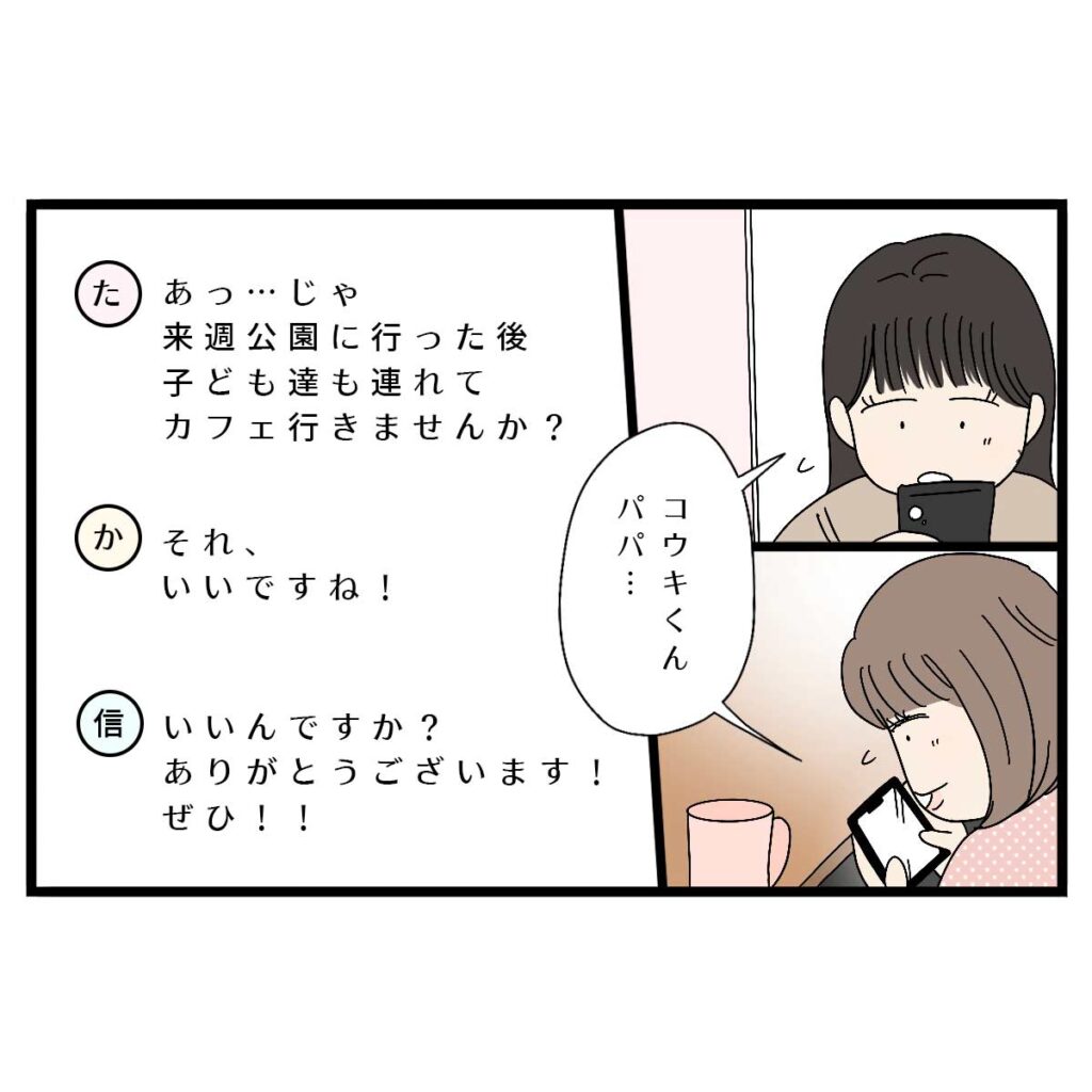 信也さんの安い手口に、すっかり乗せられてしまったママ友たち。「じゃ来週公園に行った後、子ども達も連れてカフェ行きませんか?」と代替案を提案しました。それを見た信也さんは、「いいんですか?ありがとうございます」とすかさず返事をしたのでした。