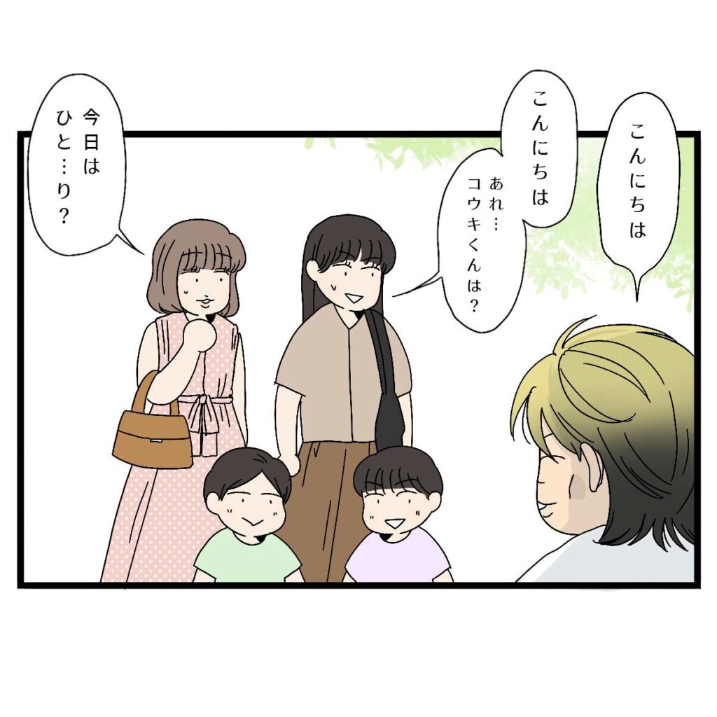 「こんにちは、あれ・・・コウキくんは?」なんと信也さんは、ひとりきりで公園に現れたのです。てっきりコウキくんを公園で遊ばせてから、カフェで相談に乗るものだと思っていたママ友たち。話が違うと困惑しながら、信也さんを見つめました。