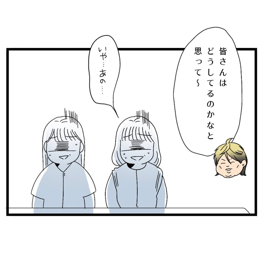 「皆さんはどうしてるのかなと思って~」ニコニコしながら問いかける信也さんに、ママ友たちは開いた口が塞がらない様子。子育ての相談相手として呼ばれたはずが、セクハラまがいの話題を振られて、驚かないはずがありません。