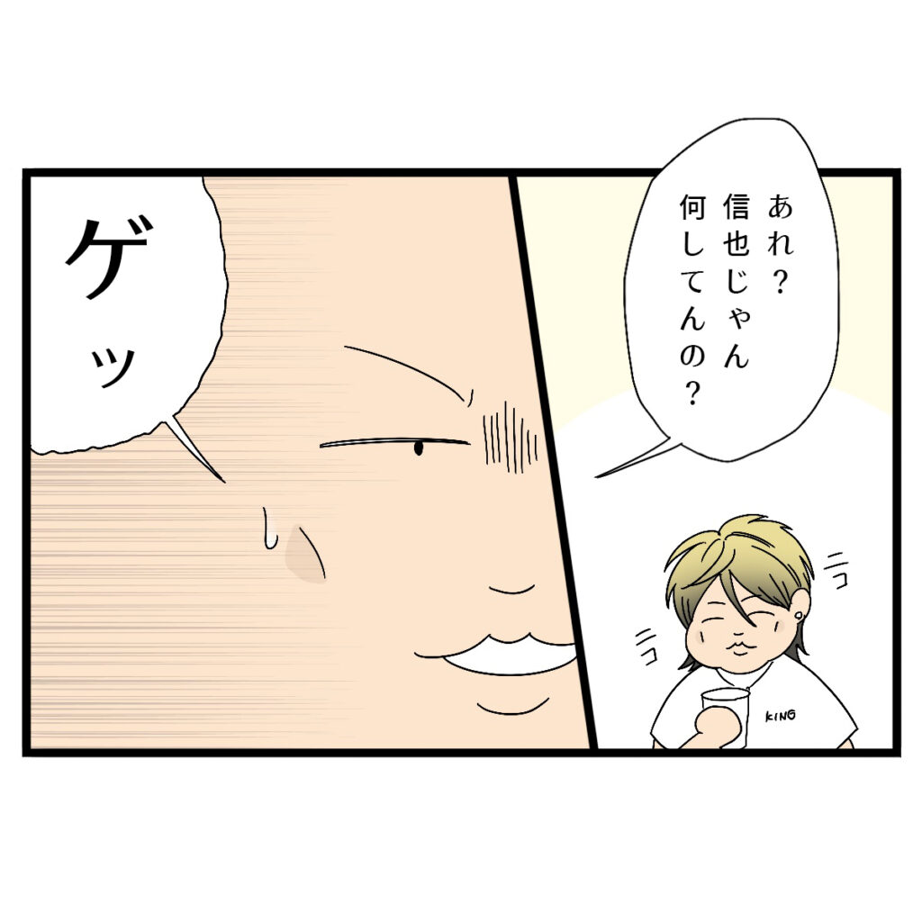 信也さんがニコニコしながらママ友たちの返答を待っていると、突然横から「あれ?信也じゃん、何してんの?」と声がかかります。信也さんは声のした方に目を向けると、立っていた人物を見て思わず「ゲッ」と顔をゆがめました。