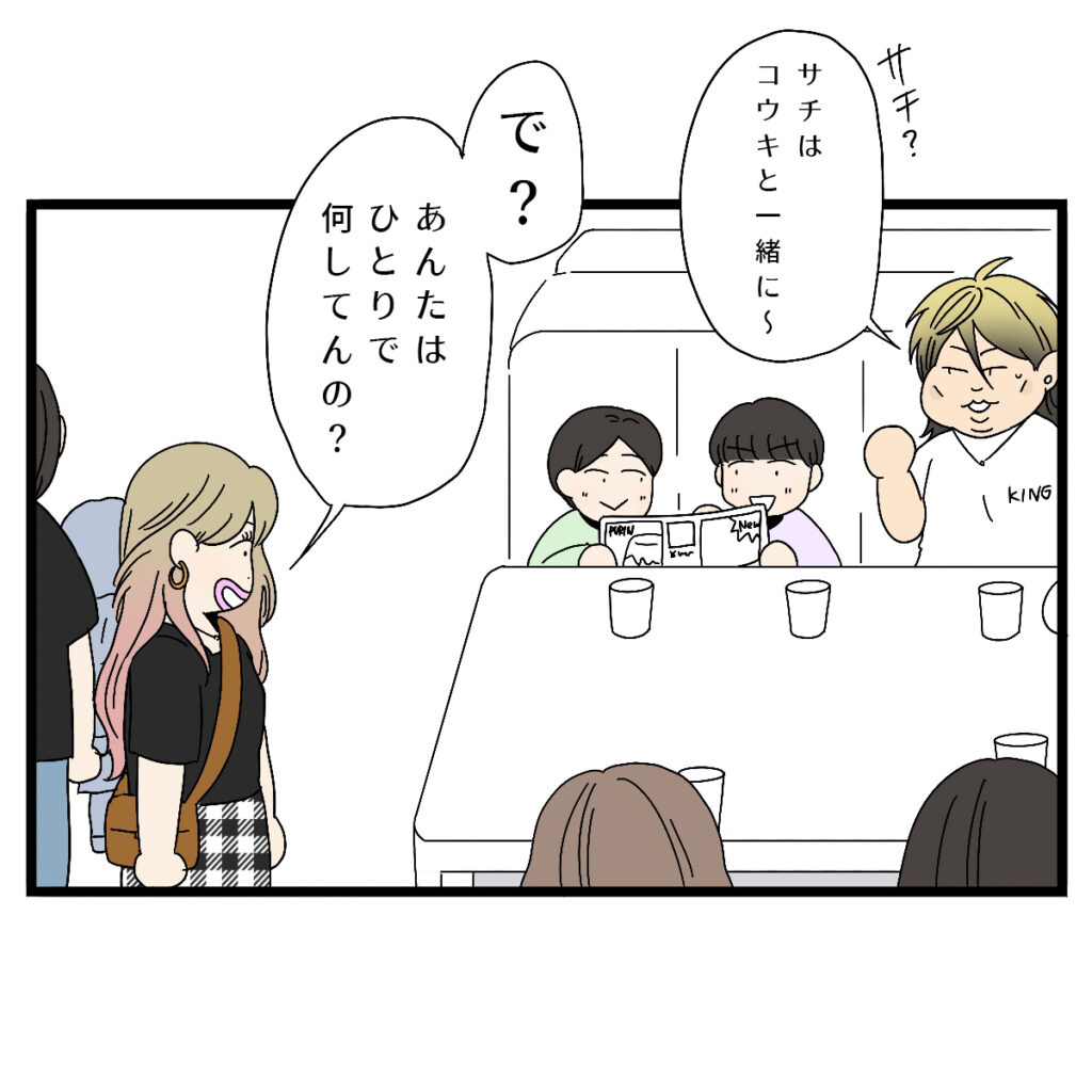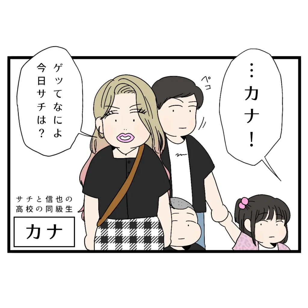 「・・・カナ!」信也さんは、最悪だと言わんばかりに顔をゆがめます。カナさんは、信也さんとサチさんの高校時代の同級生。派手な見た目とは裏腹に友達想いな性格で、サチさんとは長年の親友です。見慣れないママ友たちと一緒にいる信也さんの様子に違和感を覚えたのか、カナさんは「ゲッってなによ、今日サチは?」と問いかけました。
