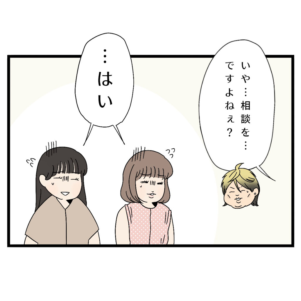 サチさんと仲の良いカナさんのことだから、下手なことを言うと告げ口されかねない・・・そう思った信也さんは「いや・・・相談を、ですよねぇ?」と、助けを求めるようにママ友たちへ視線を向けました。ママ友たちは気まずそうに「・・・はい」と応えます。