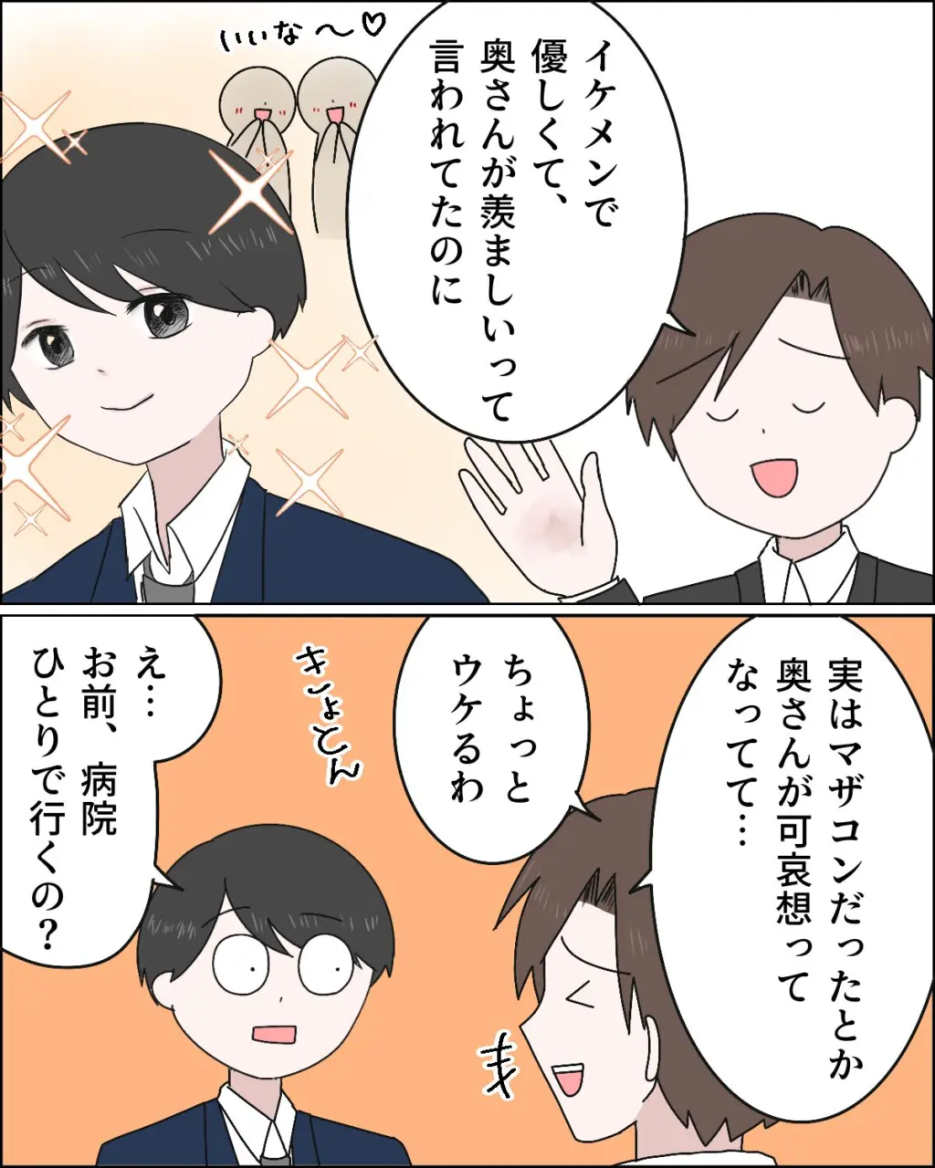 「イケメンで優しくて、奥さんが羨ましいって言われてたのに、実はマザコンだったとか、奥さんが可哀想ってなってて・・ちょっとウケるわ」とやっぱり笑いながら言う同僚に、「え・・お前、病院ひとりで行くの?」ときょとんとしながら答えるマサオさん。