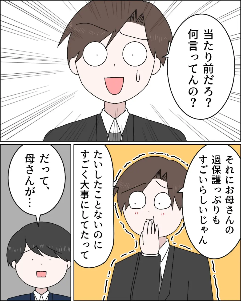 「当たり前だろ?何言ってんの?」と驚きながら、「それにお母さんの過保護っぷりもすごいらしいじゃん。たいしたことないのにすごく大事にしてたって」同僚が肩を振るわせて笑いをこらえながらそう言うと、「だって、母さんが・・」と言うマサオさんに、