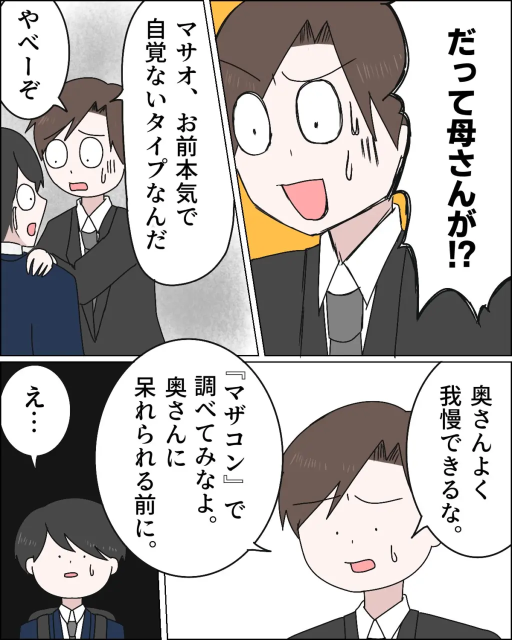 「だって母さんが!?」と驚いて言い、「マサオ、お前本気で自覚ないタイプなんだ。やべーぞ」と深刻そうに言った後、「奥さんよく我慢できるな。『マザコン』で調べてみなよ。奥さんに呆れられる前に」本気で心配し始めた同僚の言葉に「え・・」と言葉を失うマサオさんは、