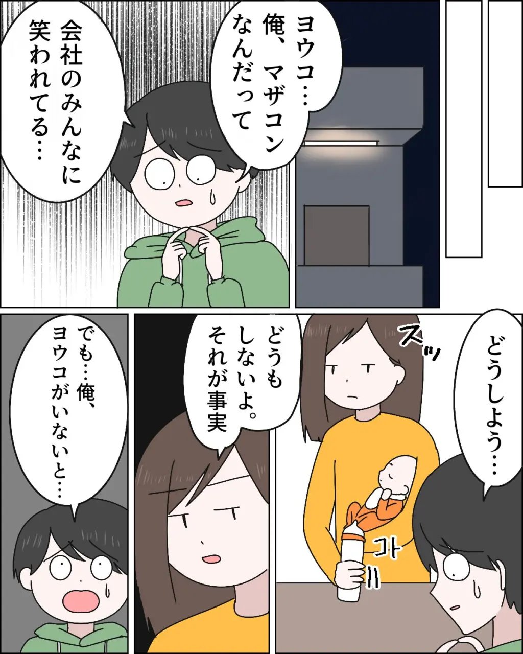 帰宅すると、「ヨウコ・・俺、マザコンなんだって。会社のみんなに笑われてる・・」と困った様子でヨウコさんに言いました。「どうしよう・・」と呟くマサオさんを見ながら、「どうもしないよ。それが事実」淡々と話すヨウコさんに、「でも・・俺、ヨウコがいないと・・」と懇願するように言うと、