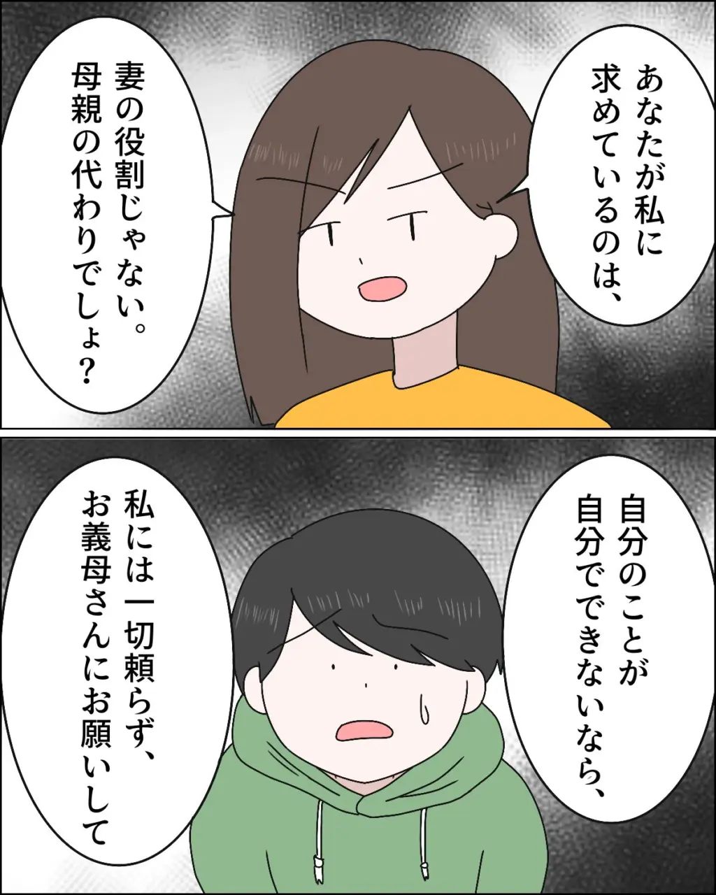 「あなたが私に求めているのは妻の役割じゃない。母親の代わりでしょ?自分のことが自分でできないなら、私には一切頼らず、お義母さんにお願いして」ヨウコさんは冷静な口ぶりでマサオさんに言いました。