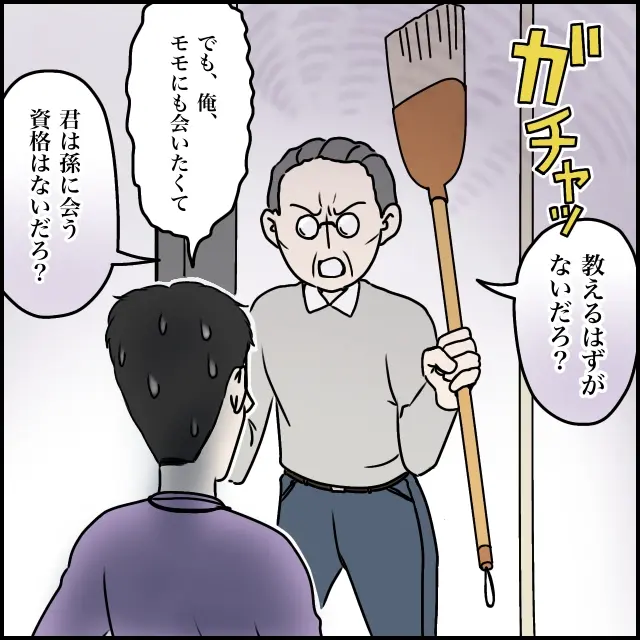 すると、ガチャと音がしてスズカさんのお父さんが登場。「教えるはずがないだろ?」と険しい表情でタカシさんに詰め寄ると、「でも、俺、モモにも会いたくて」と、モモちゃんの父親であることを伝えるも、「君は孫に会う資格はないだろ?」とお父さんに言われてしまいました。