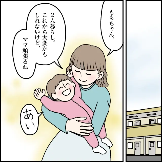 「モモちゃん。2人暮らし。これから大変かもしれないけど、ママ頑張るね」スズカさんの言葉に、「あい」と両手を上げ笑顔でこたえるモモちゃん。これまでタカシさんに散々振り回されて辛い思いもしたけれど、スズカさんは、ここから新たな生活を始める覚悟をしていたのでした。